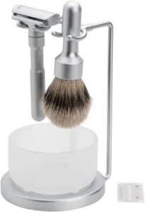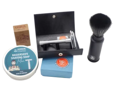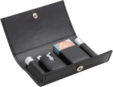 Want to look fresh even when traveling? Then the MERKUR 46C is for you. This model is a small, lightweight safety razor. All individual parts, as well as a pack of 10 razor blades, have their own place in the tidy black leather case. With the synthetic hair brush and MERKUR soap, you can create the perfect lather for your shave in no time. Many ingredients care for your skin better than some spray foams. The shaving brush made of black anodized aluminum is a lightweight and compact travel companion. With the alum stone, you get an aftershave that also repairs minor mishaps.