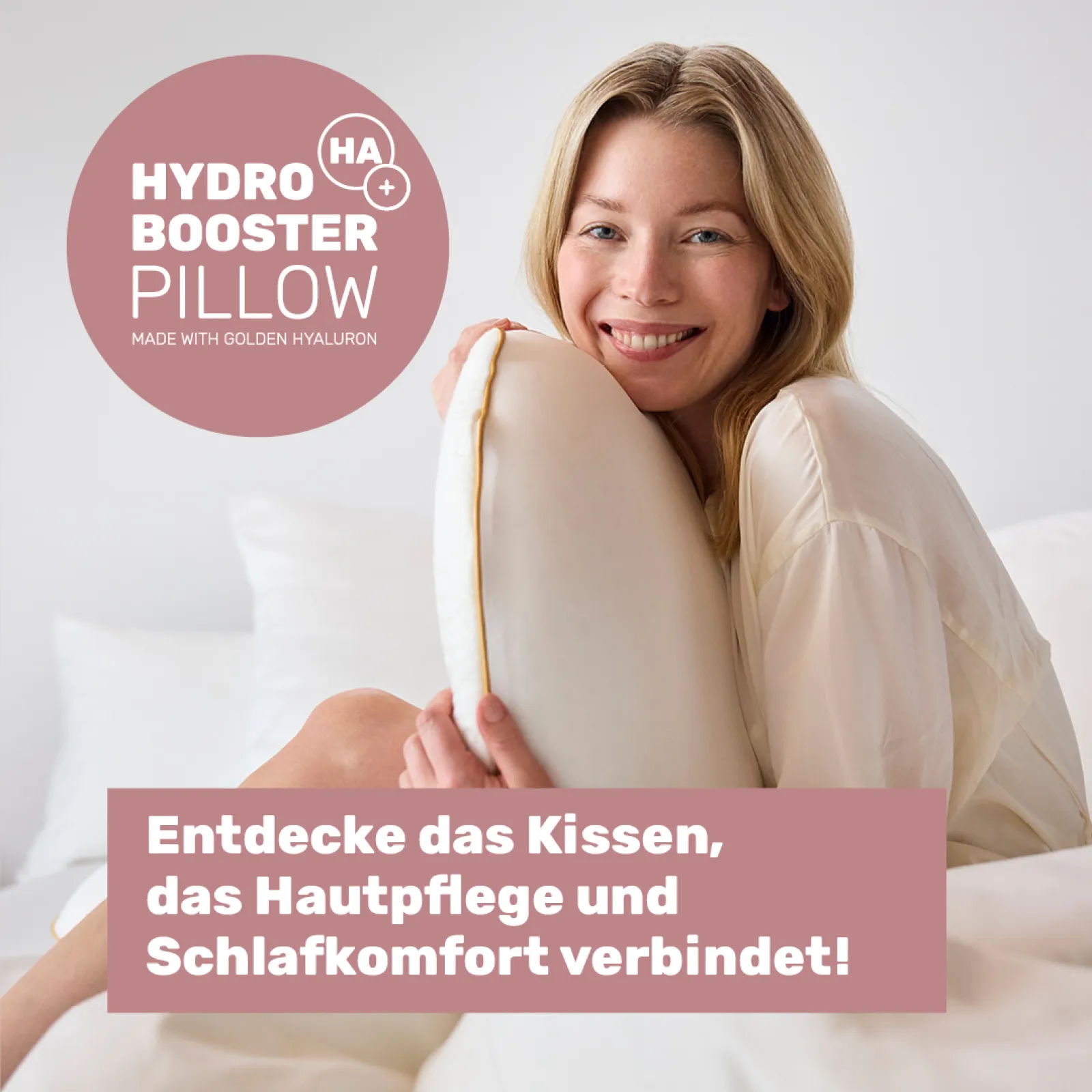 Thanks to the patented hyaluronic textile technology, your skin is continuously moisturized and revitalized while you sleep. The innovative hyaluronic substance can boost your skin’s moisture supply by up to 59 % and increase collagen production by 43 to 60 %. Support your daily skin care with the Hydro Booster Pillow.